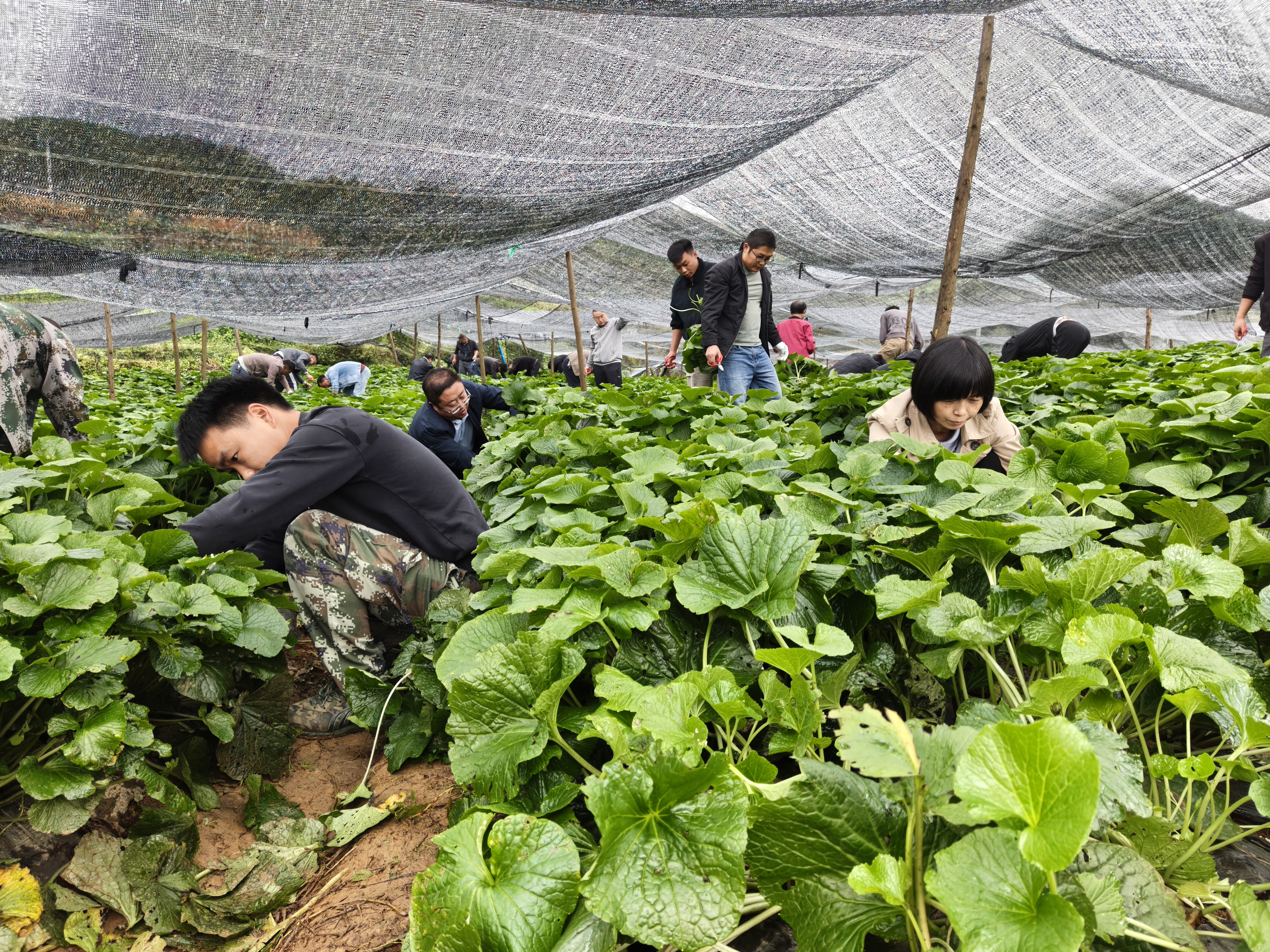 活动现场,山葵种植技术人员先向党员干部详解采收关键技巧,涵盖剪取茎叶长度、叶片与根茎分离方法及分级整理标准,保障山葵品质。随后党员干部分组分工,手持工具下田采收,或小心采撷茎叶、或仔细清理杂质、或协助分拣包装,田间呈现热火朝天的劳动景象。